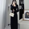Wiosenna Sukienka z Długim Rękawem, Francuska, podkreślająca talię, o średniej długości, elegancka, ze kwadratowym dekoltem, wyszczuplająca, codzienna