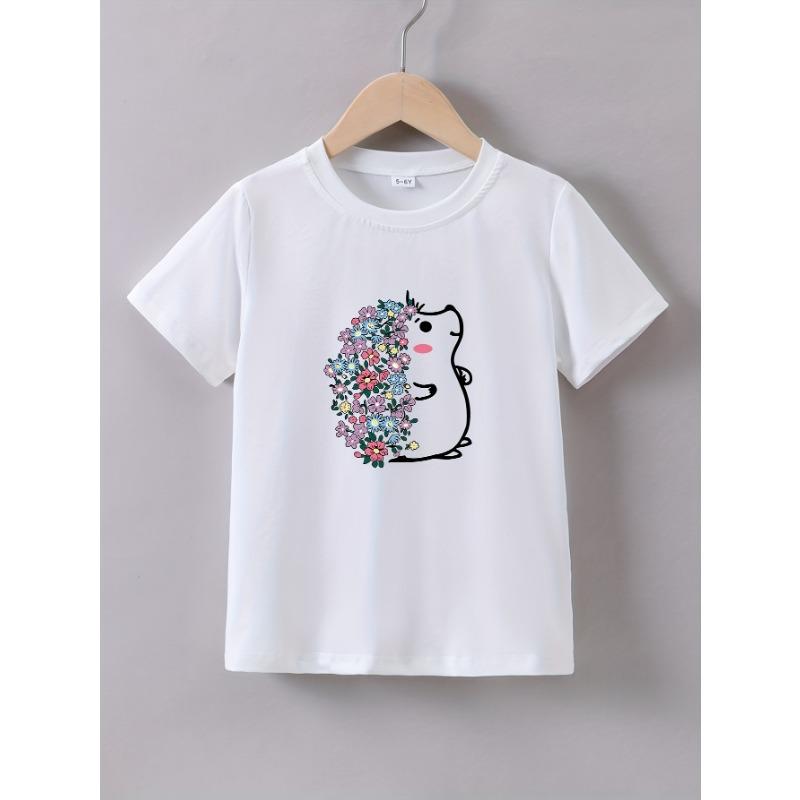 Letnie Różowe Ubranka dla Niemowląt Dziewczynek Dziecięce Codzienne T-shirty z Nadrukiem Kreskówkowym Kwiatem Jeża Dzieci Okrągły Dekolt Krótki Rękaw Top