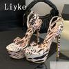 Letnia Moda Leopardzi Wzór Jedwabne Sandały na Platformie Kobiety Gruba Podeszwa Odkryte Palce Super Wysokie Obcasy Buty Bankietowe Imprezowe Balowe