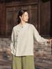 Spring/Summer 2025 Women's Retro Linen Shirt with Stand Collar, Side Placket, Color Block, Sand Wash, Frog Button, and Long Sleeves.