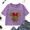 Leopard Print Red Bow Mouse Printing Washed T Shirt Womens Cotton Crop T-Shirt O-Neck Slim Clothes Short Sleeve