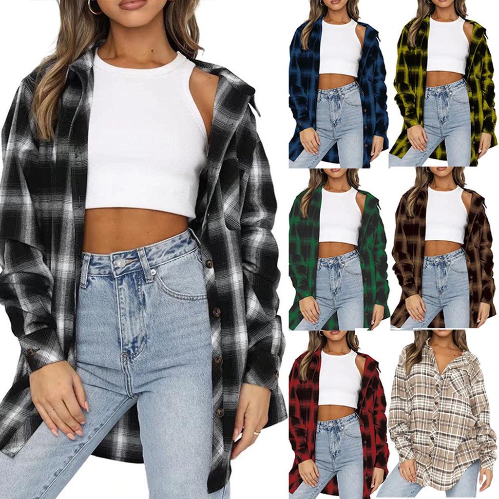 Women's And Winter Mid-Length Lapel Cardigan Single-Breasted Pocket Plaid Shirt Top
