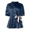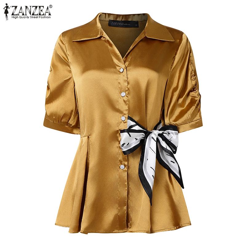 ZANZEA Damska Bluzka Satynowa z Kołnierzykiem i Krótkim Rękawem, Luźna, Casualowa, Patchworkowa