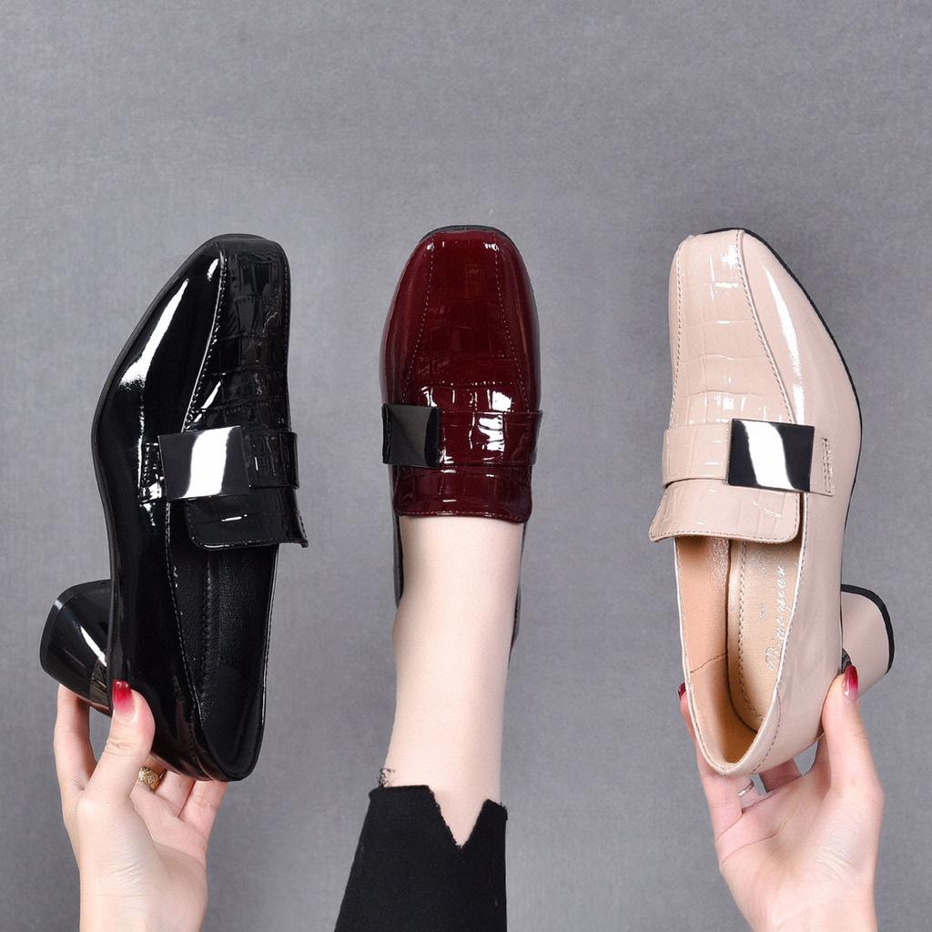 Kwadratowy nosek szpilki damskie buty wiosenne nowe lakierowana skóra bydlęca kwadratowa klamra średni obcas gruby obcas buty na płaskiej podeszwie buty do pracy małe skórzane buty