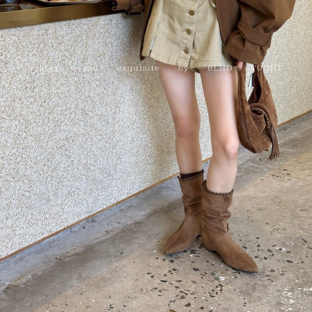 2025 nowe buty internetowej celebrytki, retro zamszowe szpiczaste na niskim obcasie, plisowane, średniej długości cholewki, modne, casualowe, kowbojskie buty damskie