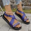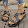 Modne sandały plażowe casual z rzymskimi nitami dla kobiet, modne wszechstronne płaskie sandały z otwartymi palcami zapinane na krzyżową klamrę, buty damskie, klapki