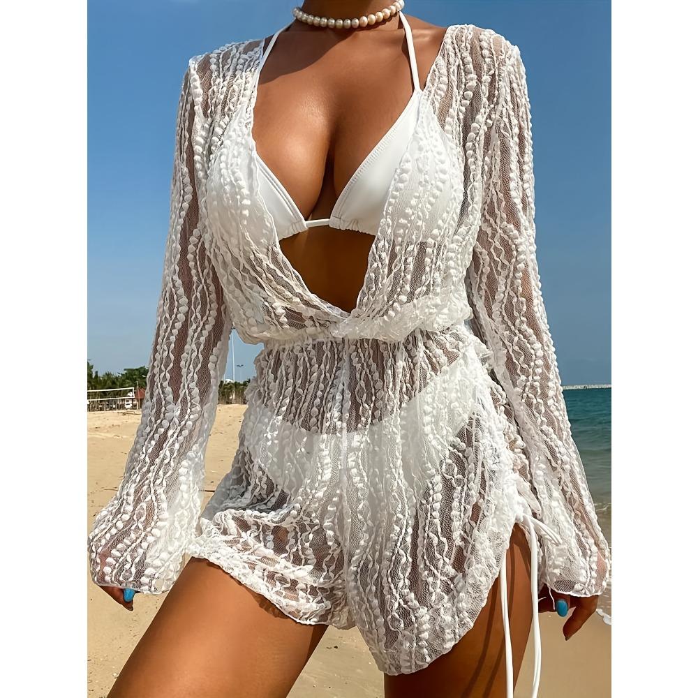 1pc of Drawstring Tied Hollow V-neck Dress, Short Sleeved Summer Vacation Skirt, Women's Beachwear