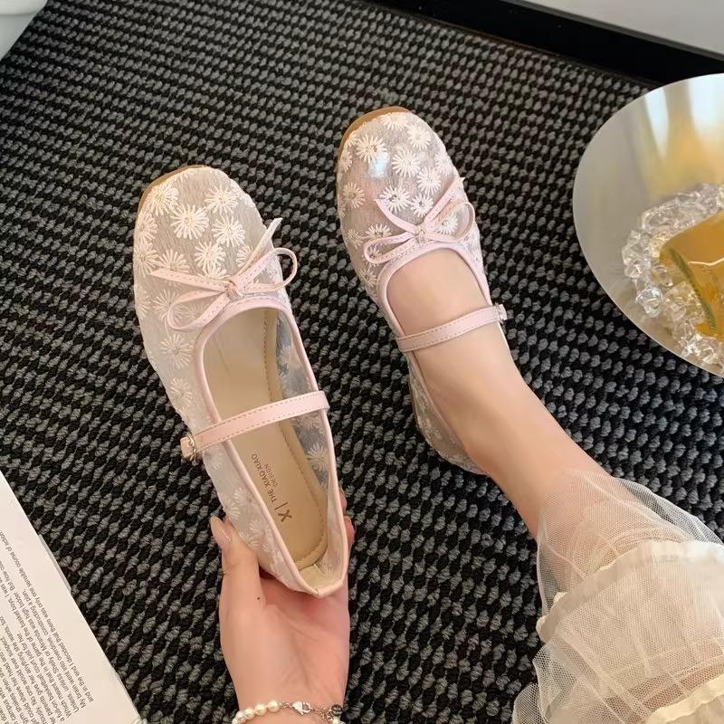 Małe wróżkowe koronkowe siateczkowe pojedyncze buty damskie lato wersja koreańska wygodne słodkie buty Doudou na jeden pedał płytkie buty Mary Jane