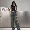 Fashionable Comfortable Washed Waste Soil Wind Broken Hole Jeans Women Big Size Drape Straight Dragging Long Trousers Jeans for Women Long Denim Pants
