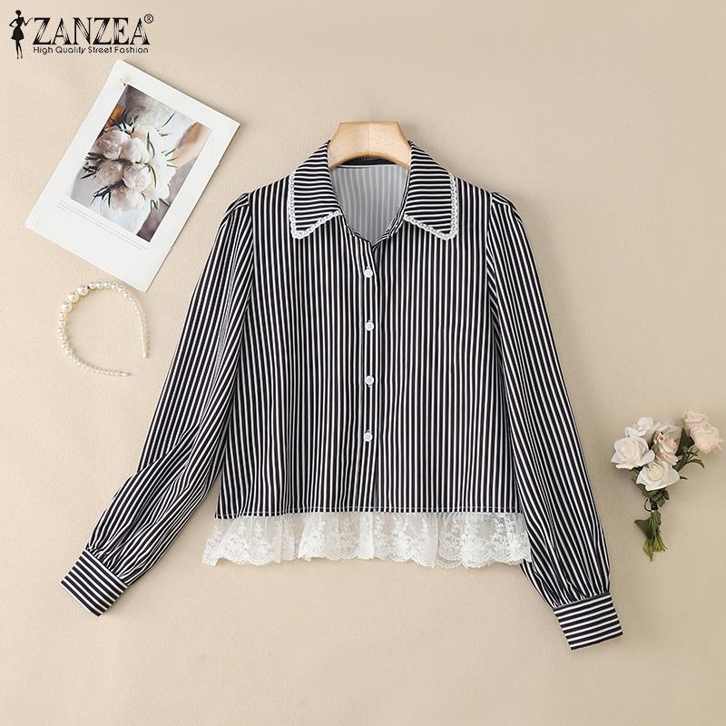ZANZEA Kobiety Casualowy Kołnierzyk z Wykładanym Kołnierzykiem Długi Rękaw Koronkowa Wstawka Paski Bluzka