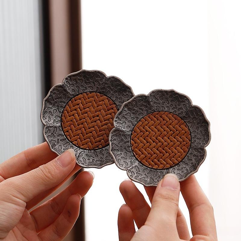Antique silver alloy teacup pad, bamboo mat, thermal insulation teacup, cup holder, tea saucer, kung fu tea set accessories