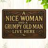 "Mieszka tu Miła Kobieta i Zrzędliwy Staruszek" okrągły metalowy znak, 8x8 cali.