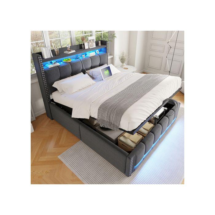 Łóżko tapicerowane 140*200 cm z oświetleniem LED i gniazdem USB, wezgłowie z półkami i przestrzenią do przechowywania