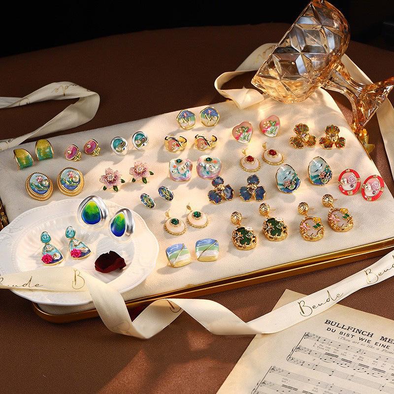 Seria obrazów Van Gogha Moneta: Kolczyki sztyfty z emalią i naturalną perłą w kształcie francuskiego kwiatka, srebro próby 925, kolekcja letnia.