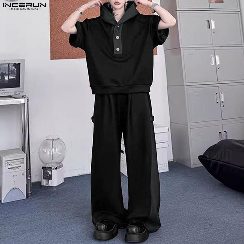INCERUN Two Pieces Men Short Sleeve Splicing Hooded T-shirts Long Pants Sets