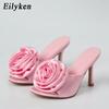 Fashion Eilyken Summer Fashion Silk Flower Peep Toe High Heels Slipper Stripper Slip On Mule Slides Women Party Sexy Sandal Shoes