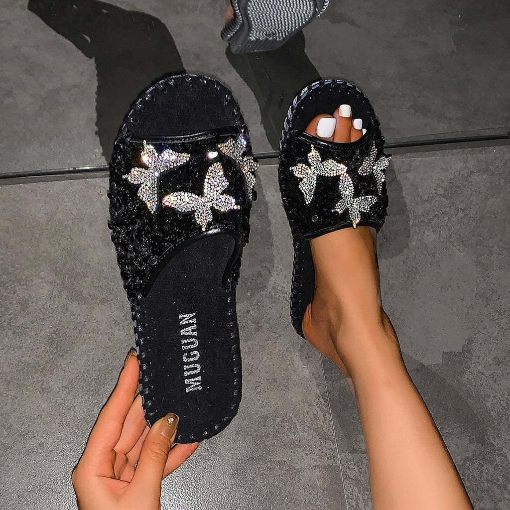Fashion Women Shiny Slippers 2024 New Summer Fashion Sequins Sandals Butterfly Rhinestones Sandals Casual Flats Shoes Zapatos De Mujer