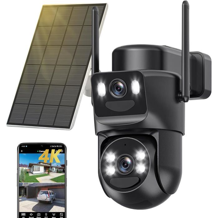 Caméra de Surveillance Extérieure WiFi 8MP 4K - Double Objectif, Vision Nocturne Couleur, Panneau Solaire, 360°, Audio…