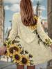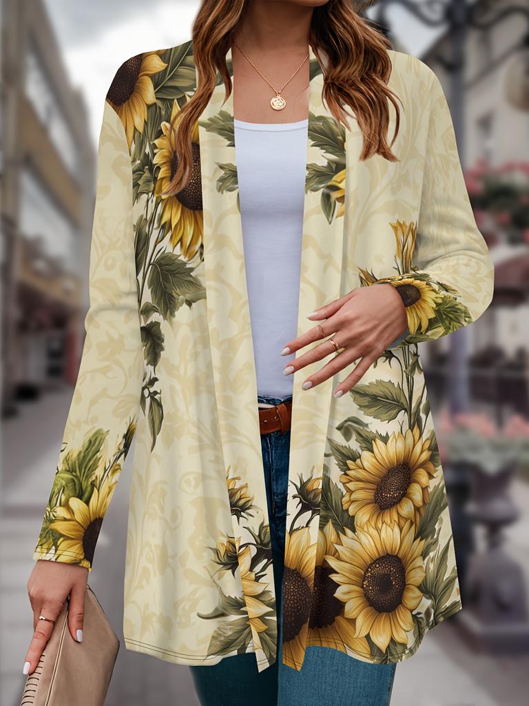 Women'S Plus Size Casual V-Neck Cardigan - Sunflower Print Knit Polyester Open Front Long Sleeve Overcoat for Spring & Fall