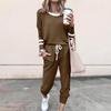 Damski Modny Luźny Kolorowy Blok Paskowany Długi Rękaw Okrągły Dekolt Sznurek Sportowy Casualowy Top i Spodnie Dwuczęściowy Zestaw