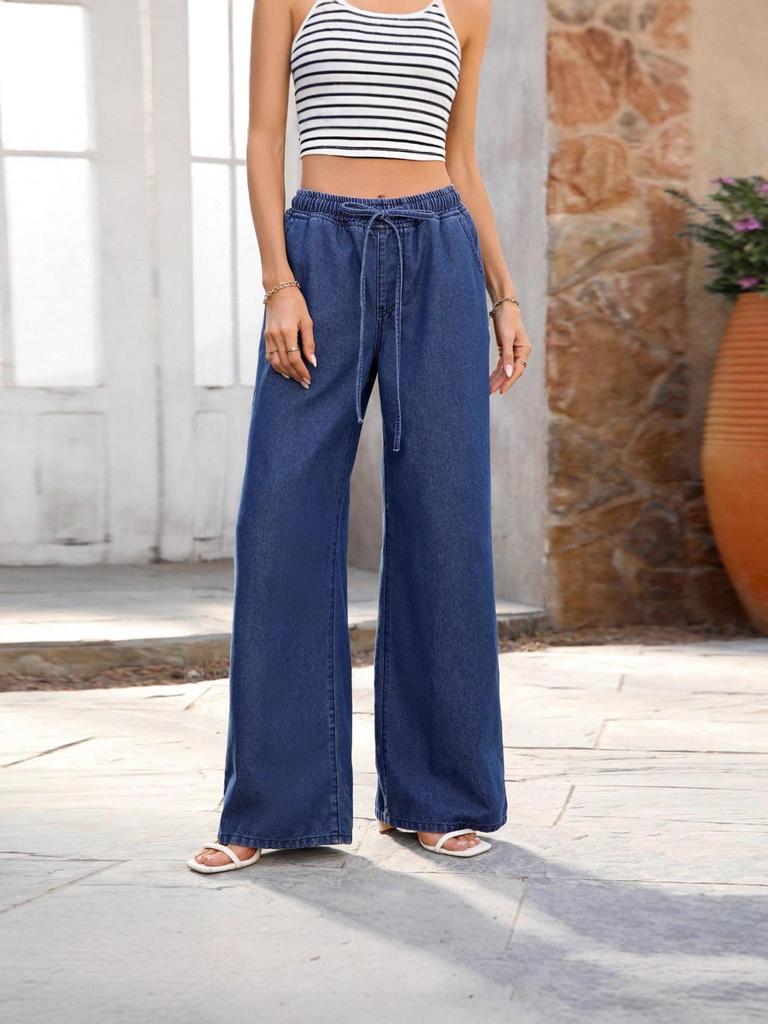 Damskie jeansy z wysokim stanem, luźne, szerokie nogawki, rozciągliwe, ze sznurkiem do ściągania