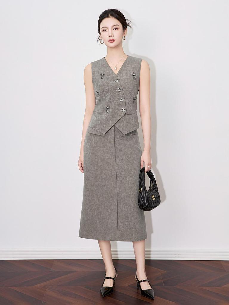 Old Money V-neck Button Vest & Fashionable Midi Skirt Two-piece Set