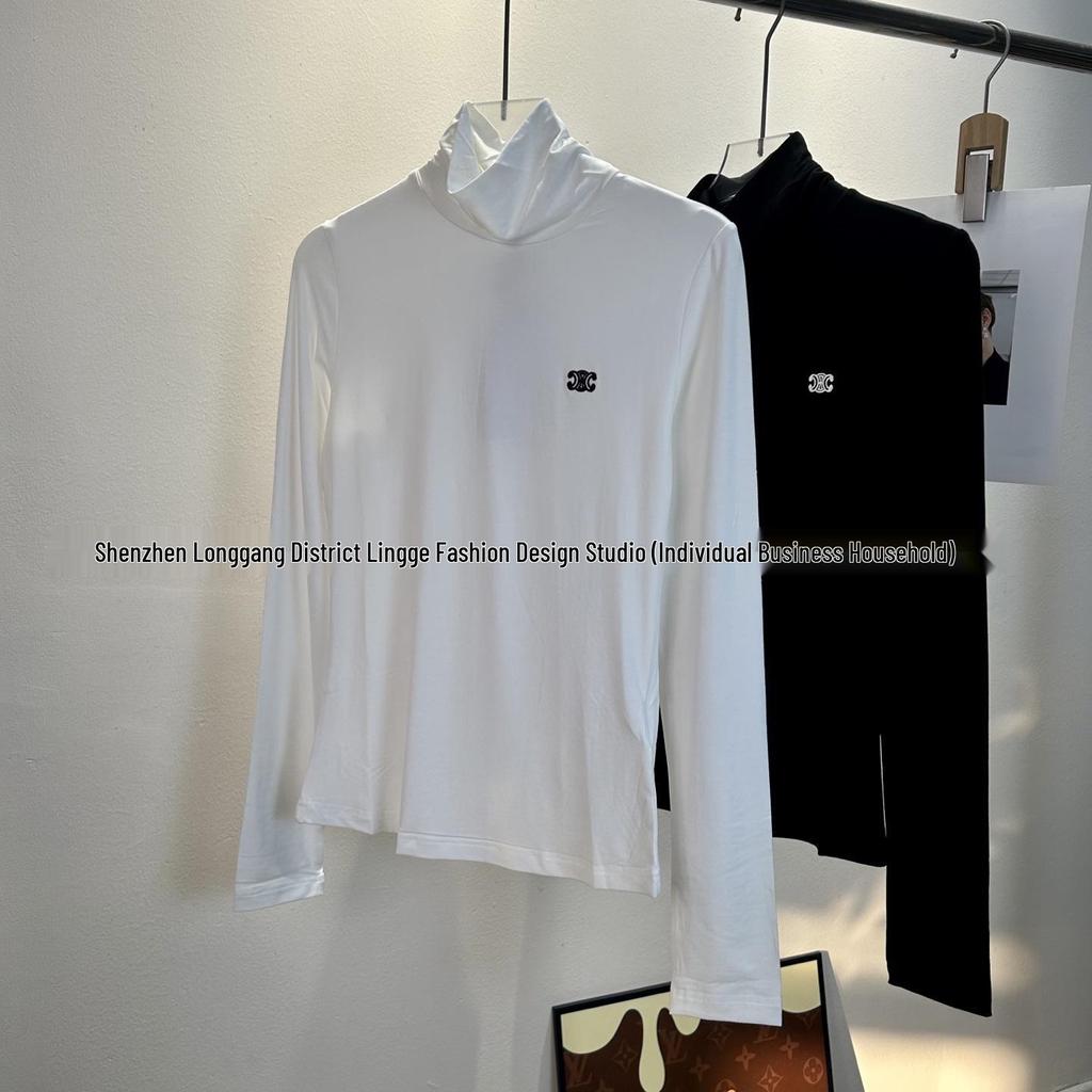 Damski T-shirt LENGE w stylu retro, z wysokim dekoltem, dopasowany, z haftem Łuku Triumfalnego