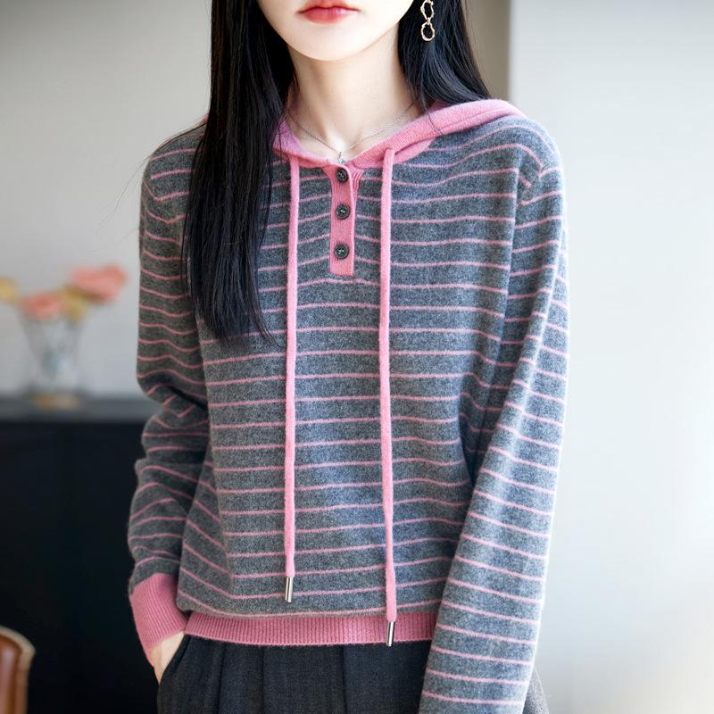 Damski sweter z kapturem ze 100% czystej wełny - Nowy luźny fason dzianinowy jesienno-zimowy