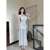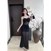 Seksowna sukienka bodycon z siateczki na cienkich ramiączkach - Półprzezroczysta, z wycięciem w talii