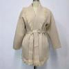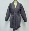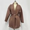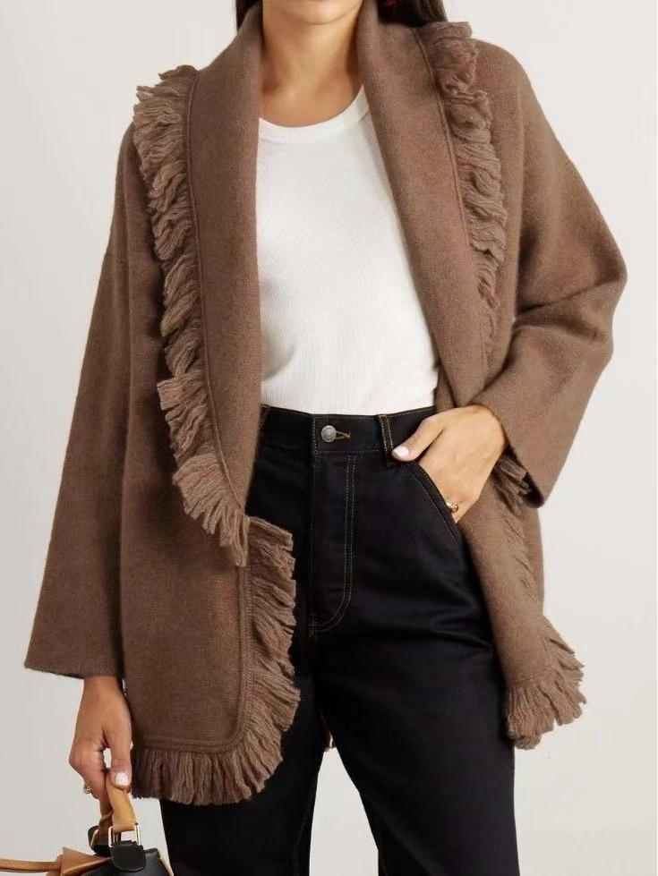 Jesienno-zimowy kardigan sweter płaszcz w kolorze kawy z frędzlami, średniej długości, w stylu retro