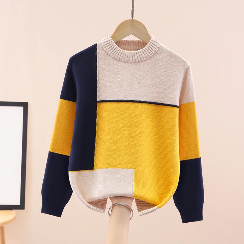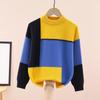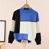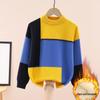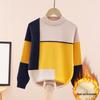 Chłopięcy bawełniany sweter z okrągłym dekoltem w blokach kolorystycznych - z podszewką polarową, gruby dzianinowy na jesień/zimę.