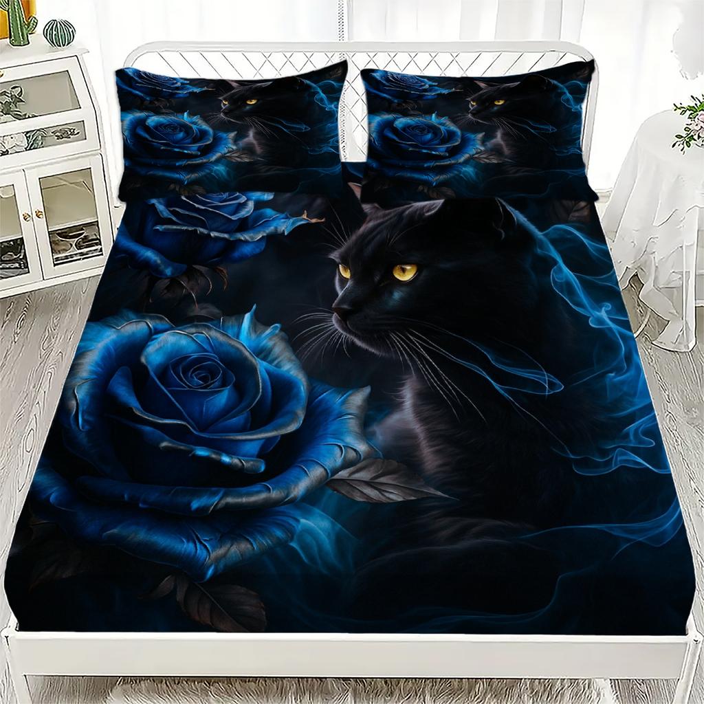 1PC Fitted Sheet Beautiful Flowers Cat Print Set 100% Polyester Mattress Covers Cozy Bedding Set Gift Bedroom Decor 2 Pillowcase