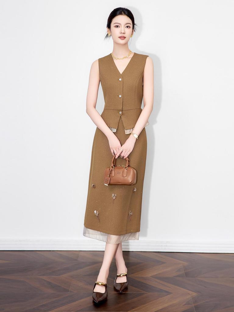 Modny zestaw kamizelki z dekoltem w serek i organzowej spódnicy z cekinami w kształcie gwiazd
