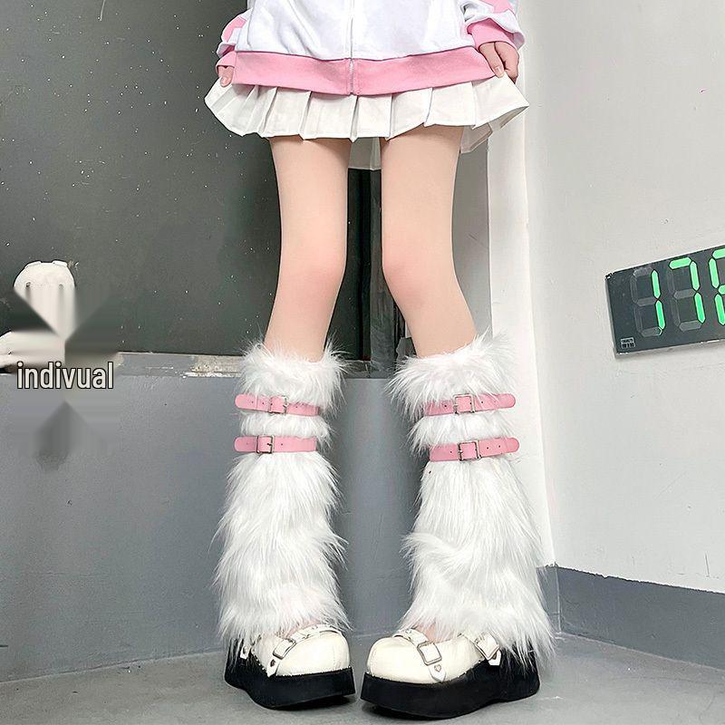 Różowe puszyste getry z imitacji futra z skórzaną klamrą i kółkami