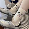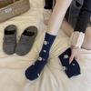 Boneless and Cute Style Flocked Embroidered Puppy Mid-calf Socks, Double Flared Striped Fabric Label Socks, Pure Cotton for Women