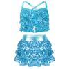 Dziewczęcy kostium do tańca jazzowego, błyszczące cekiny, warstwowe falbany, skrzyżowane plecy, metaliczny crop top, zestaw szortów