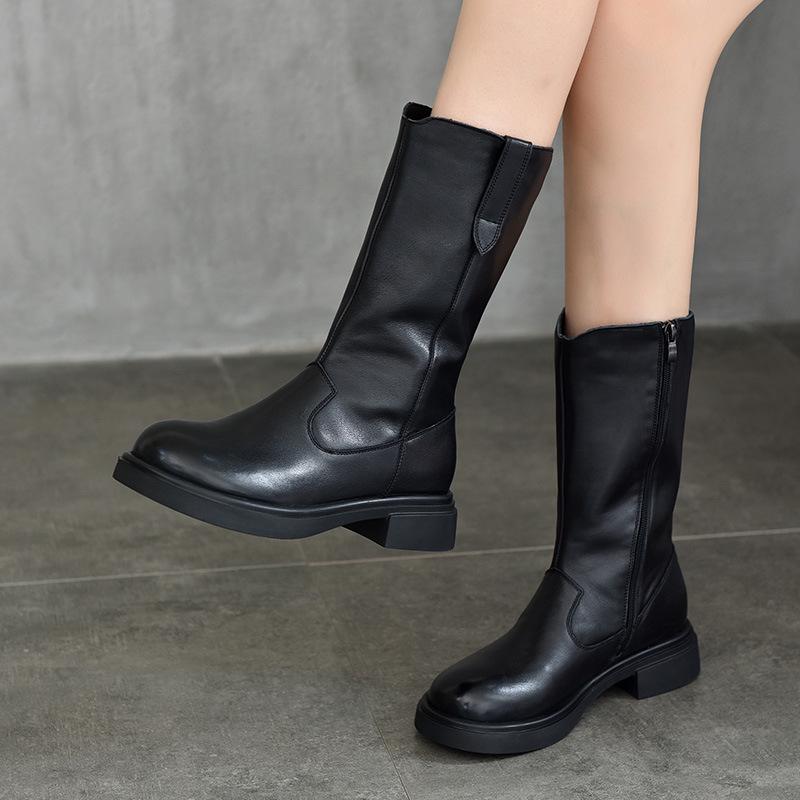 Botki jeździeckie do połowy łydki z prawdziwej skóry z bocznym zamkiem błyskawicznym, 2025 Jesień/Zima, ocieplane polarem, damskie kozaki na średnim obcasie ze skóry bydlęcej.