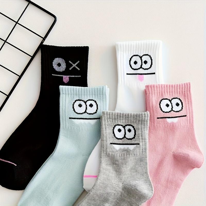 5 Pairs Fun Print Women's Socks - Korean Style Mid-Calf Trendy Cute Cartoon Breathable Comfort Casual Socks