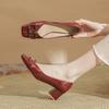 Różowe lakierowane skórzane czółenka na wysokim grubym obcasie, damskie buty z kwadratowym noskiem, metalową klamrą i wkładką ze skóry owczej.