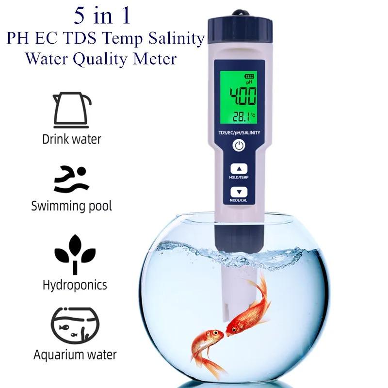 5 in 1 EC TDS Salinity Temperature PH Meter Water Quality Tester for Food Beverages Salt Content Aquarium Seawater ATC Meter