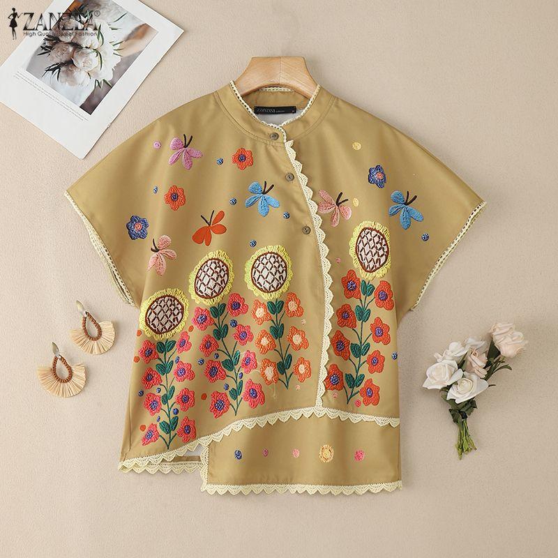 ZANZEA Damska bluzka z krótkim rękawem i okrągłym dekoltem w kwiaty