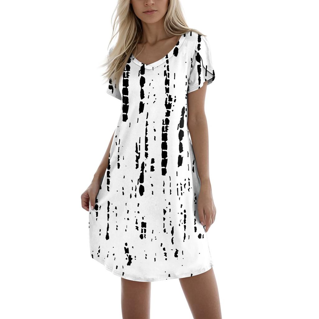 Damska modna, swobodna sukienka z nadrukiem, dekoltem w serek, krótkim rękawem