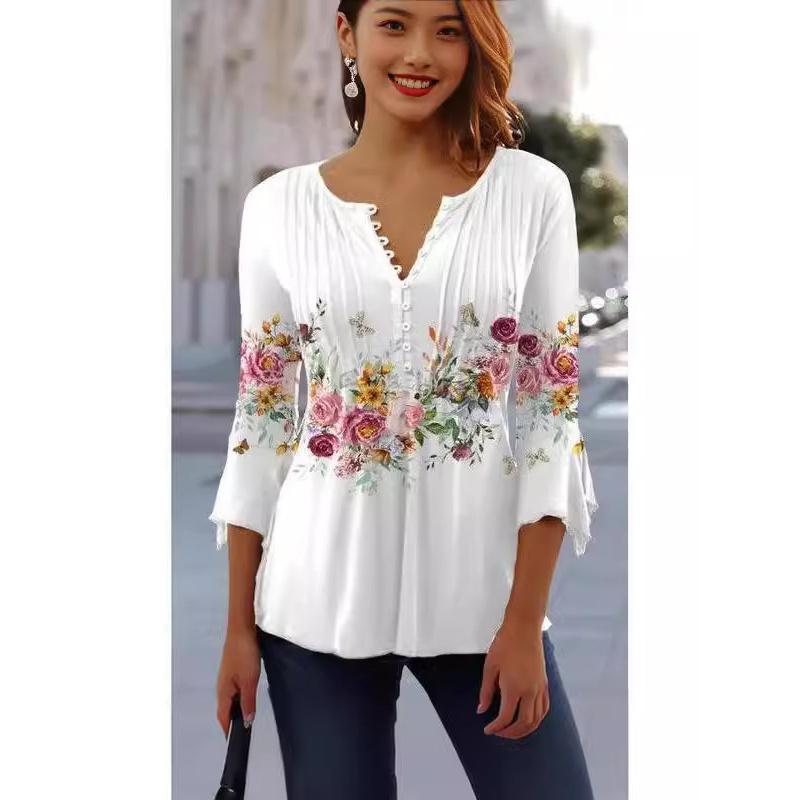 Moda Wiosna Lato Nowa Damska Koszulka Bazowa z Plisami i Guzikami z Dekoltem V i Krótkim Rękawem w Kwiatowy Wzór