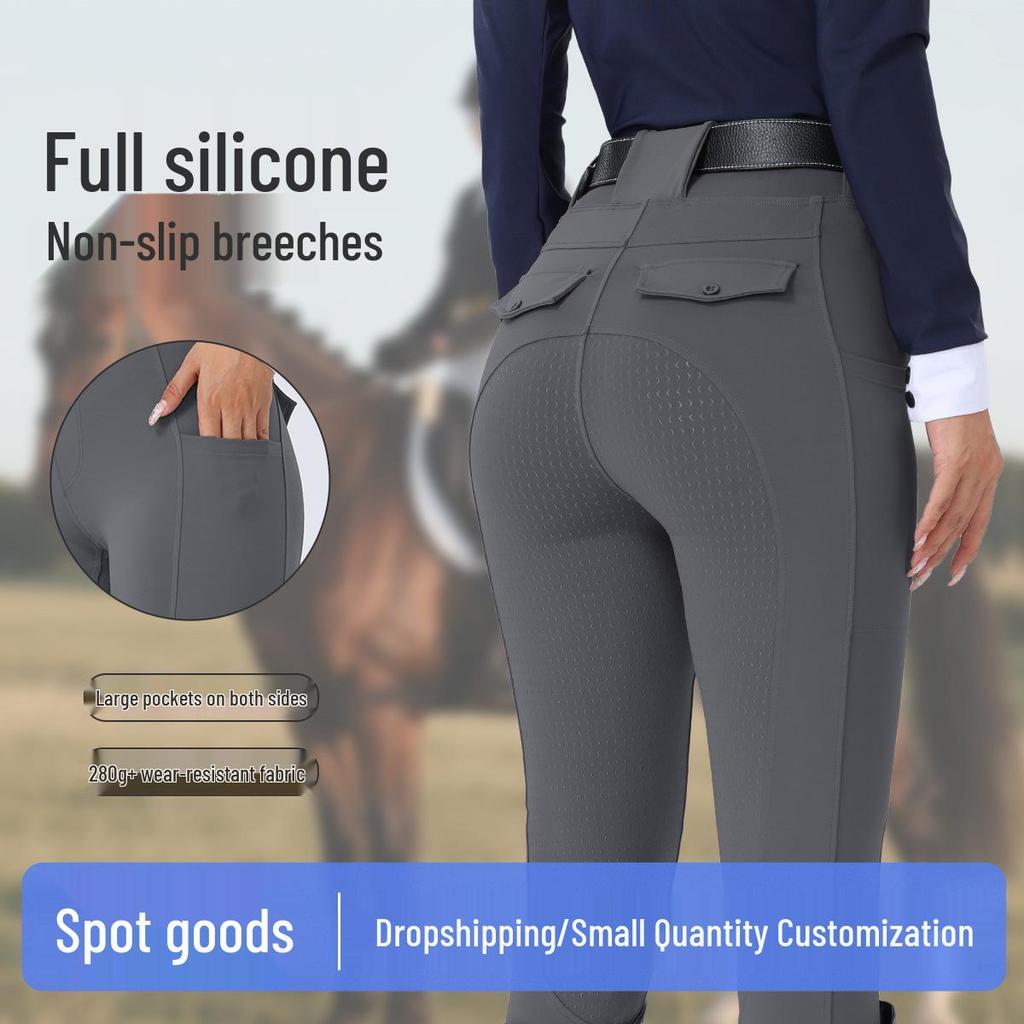 Damskie białe silikonowe bryczesy jeździeckie z pełnym lejem antypoślizgowym - Elastyczne obcisłe spodnie konkursowe jeździeckie, styl europejski i amerykański.