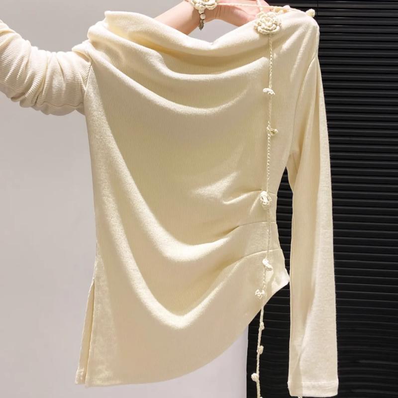 Hot Girl Swing Collar Sloping Shoulder Flower Lace Long Sleeve T-Shirt Women's 2025 Early Autumn New Pleated Waist Bottoming Top