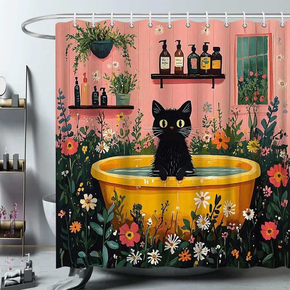 Czarny Kot w Żółtej Wannie Zasłona Prysznicowa Kwiatowy Ogród Śmieszny Kot Rodzina Zwierzę Domowe Uroczy Zwierzęcy Wzór Łazienka Poliestrowe Zasłony S