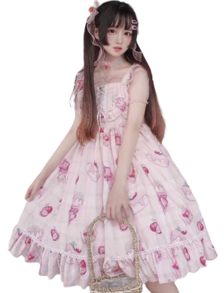 Lady Lazy Lolita Dress, Cosplay, Knee-Length Jumper Skirt with Sweets Pattern (Pink)