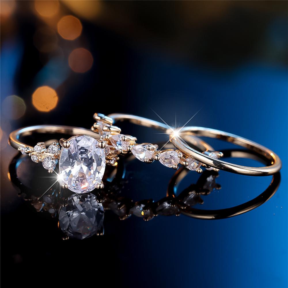 Crystal Female White Oval Zircon Stone Ring Set Luxury Gold Color Bridal Wedding Engagement Jewelry For Women