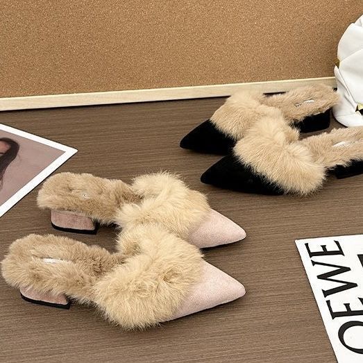 Wearing a pedal Internet celebrity temperament Baotou half-tow thick heel pointed head plush cotton slippers female winter