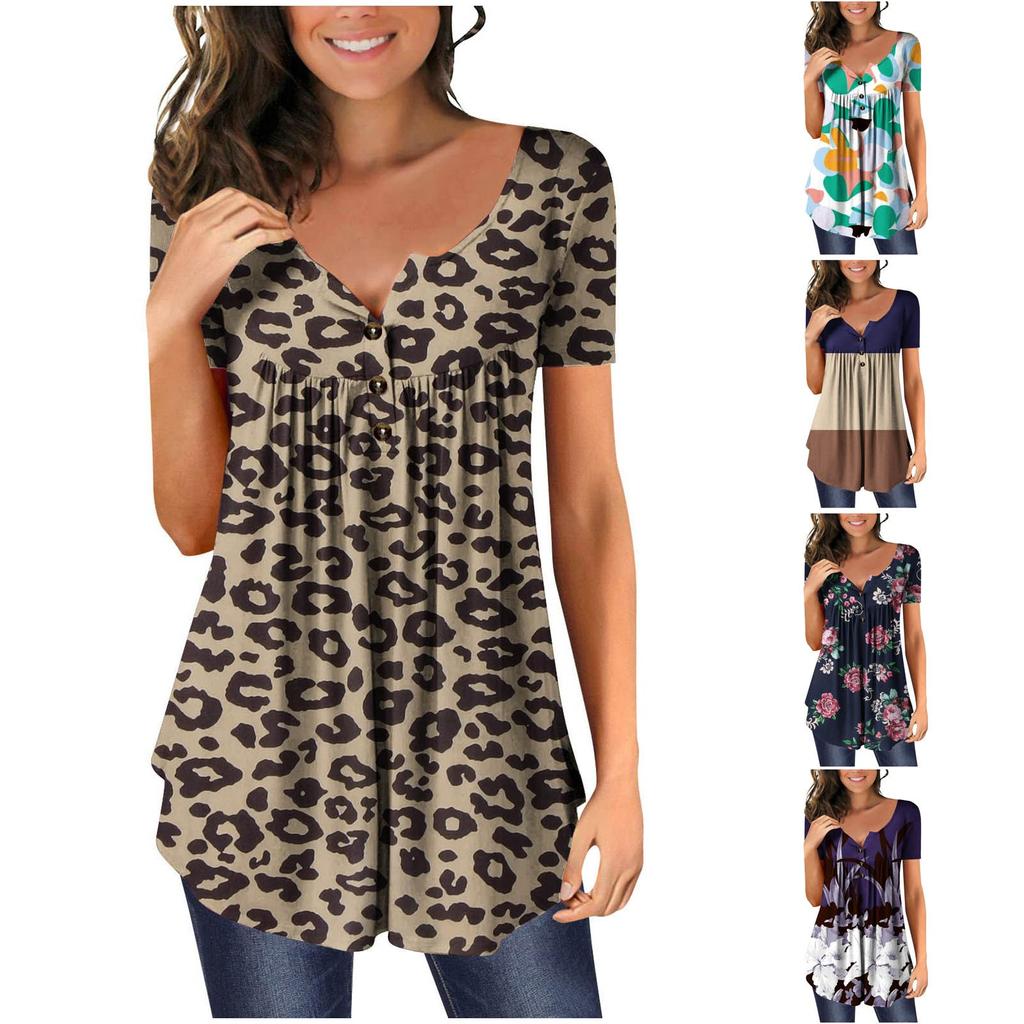 Women's V-Neck Color Block Patchwork Printed Button Flower Short Sleeve T-shirt Top